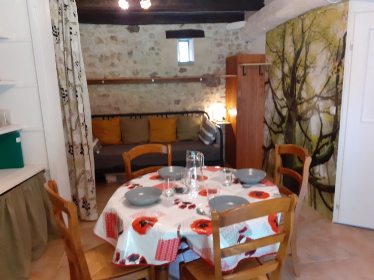 – 1 salon/salle à manger avec 1 banquette/lit 2 places (160×200 cm) ;